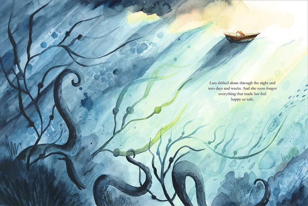 Out to Sea follows the journey of a young girl named Lara who is so sad after the death of her grandmother that she is carried out to sea on a flood of her own tears. When it seems like sadness has overwhelmed her entirely, she discovers a pearl at the bottom of the ocean that triggers memories of the many happy times Lara shared with her grandmother. With the pearl safely at her side, Lara realises that she is not alone and finds the strength to pick up her oars and row herself back home.