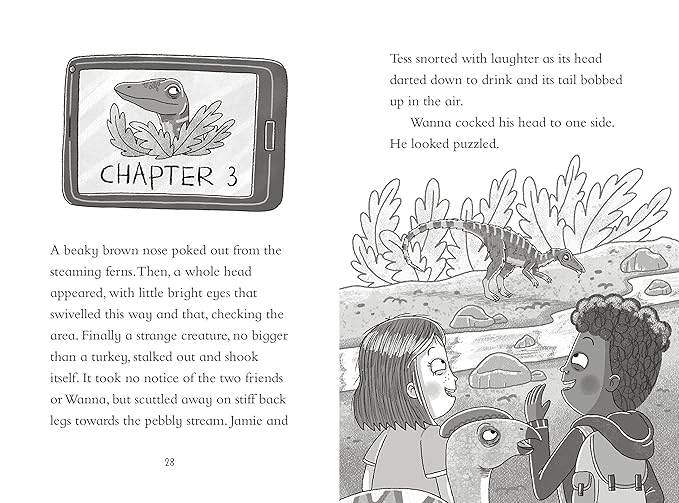 Jamie is exploring Ammonite Bay when he meets Tess. Tess is a member of Dinosaur Club who lives in Ammonite Bay too. She shows Jamie around, including her favourite place - a secret cave with fossils all over the walls. But what's that strange tunnel at the back? Together they go through the tunnel and they discover some dinosaur footprints. Jamie and Tess walk along them...and the two new friends find themselves back in the time of the dinosaurs! It's amazing, but dangerous too - and they'll definitely need help from the Dinosaur Club...