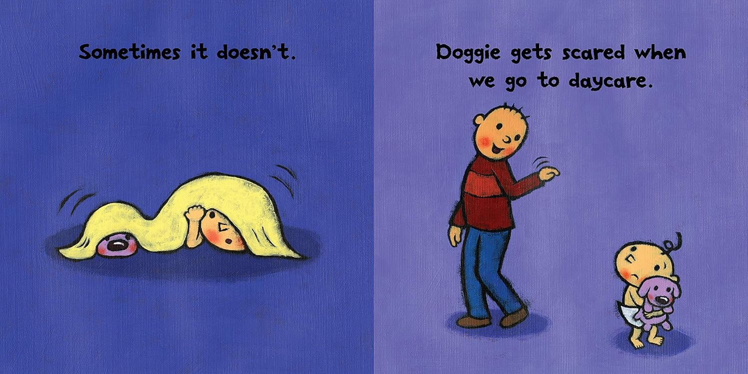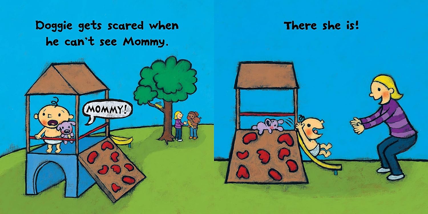 Baby's toy Doggie is scared of many things: shadows, swimming pools, strangers, loud noises. Boom! Good thing Baby is there to help, with a trusty blankie (which sometimes works). Baby also comforts Doggie at nursery and at the playground when Mummy steps out of their sight. But when Doggie himself goes missing, could that be too scary even for brave Baby? Leslie Patricelli gives a fearless new spin to a universal toddler experience and offers a few suggestions for things that can help the scary go away.