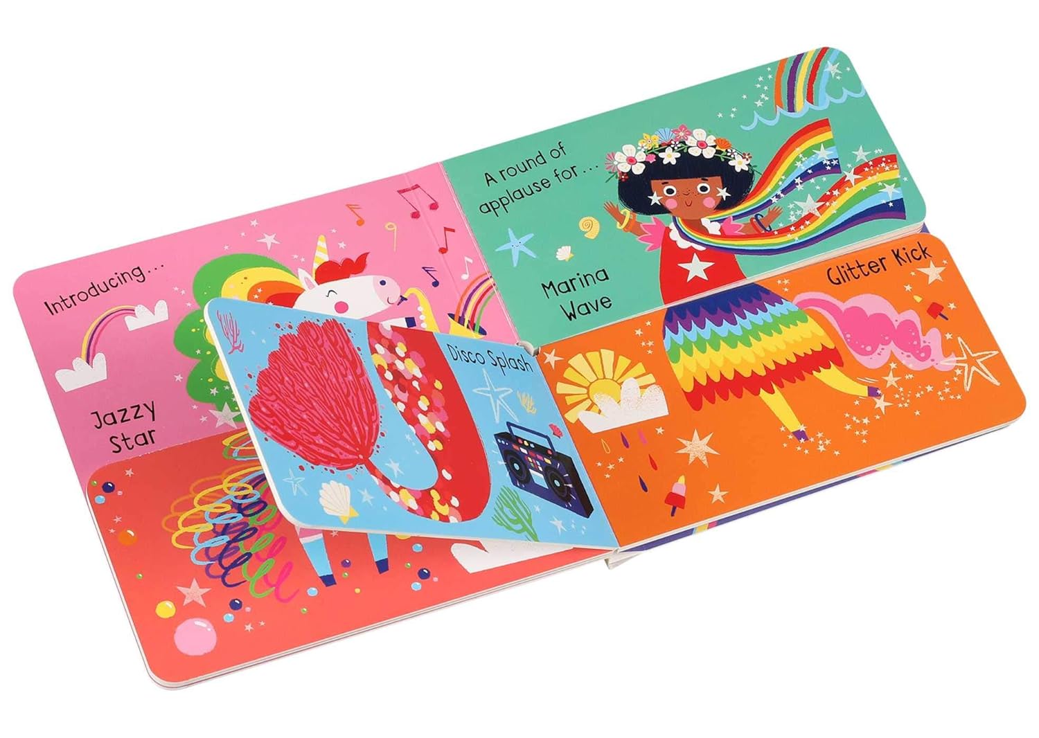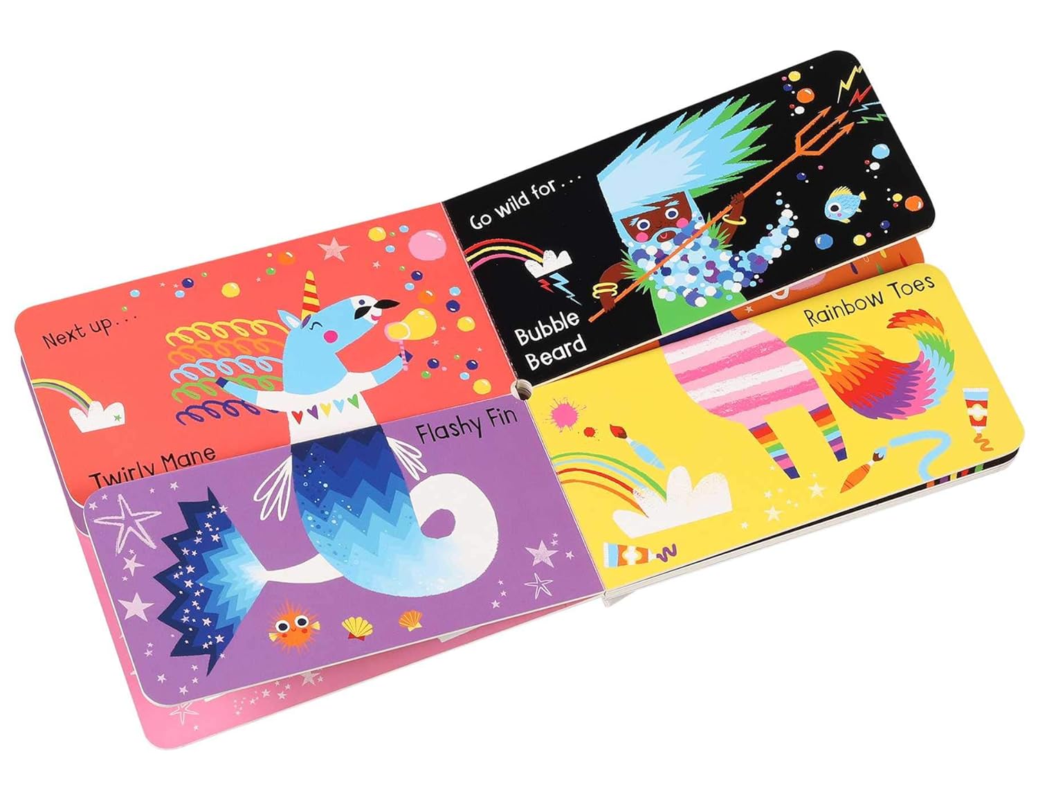 Mix and match mermaids and unicorns to make lots of new flip flap friends with this colorful split-page book. Watch as hoofs, horns, and tails get all mixed up in this rainbow book of new mermicorn friends.