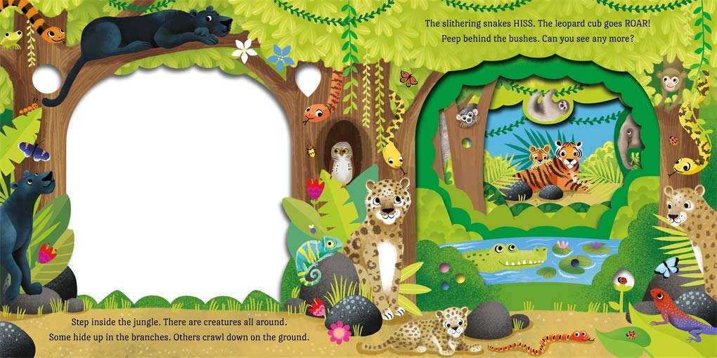 Step inside the jungle with this exciting, interactive board book, perfect for animal lovers. As the peek-through pages reveal each scene, little explorers will meet treetop parrots, sleepy sloths, tiger cubs and more on their jungle journey.