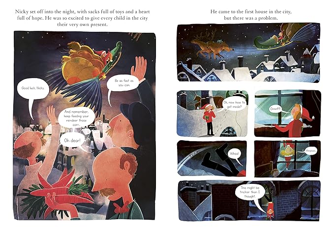 One day, Nicky notices a young girl with her face pressed up to the glass. When she disappears, he follows her and finds her living on the streets with lots of other children, none of whom can afford a toy. Nicky vows that for one night only, every child will have the toy of their dreams and—with the help of his uncles and some flying reindeer—the legend of Father Christmas is born.