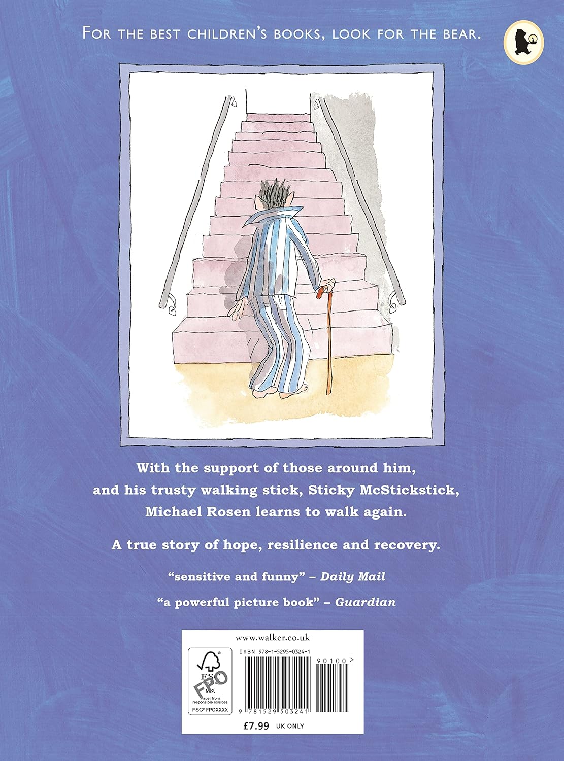 A powerful and personal story from one of Britain's best-loved authors about his recovery from coronavirus. After being admitted to hospital in 2020 with coronavirus, Michael Rosen had to learn to walk again. With the support of doctors and nurses and a walking stick he names "Sticky McStickstick", he manages to embark on the slow steps to recovery. This moving picture book from the former Children's Laureate, with illustrations from Tony Ross, tells a story of perseverance and hope, and is a testament to the importance of overcoming fear and learning to accept help.