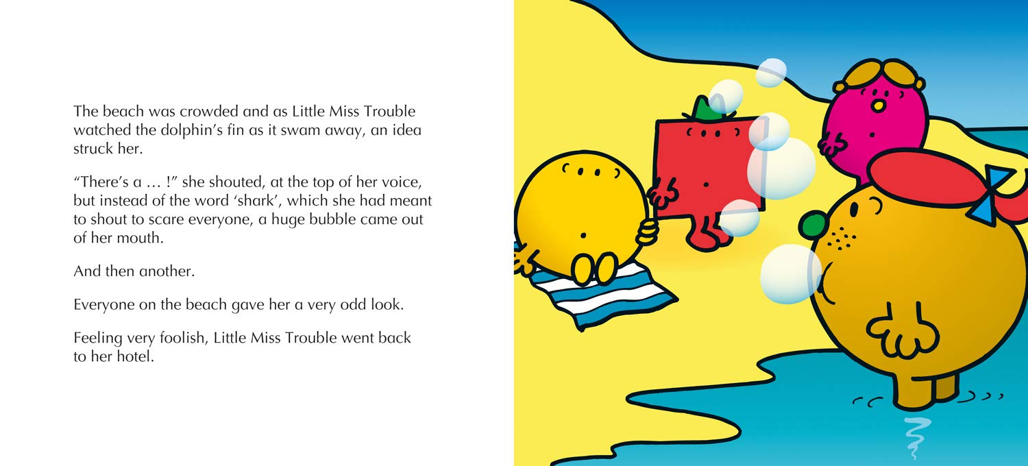 When Little Miss Trouble catches a mermaid with her fishing rod she finds herself at the beginning of a watery adventure that will teach her an important lesson.