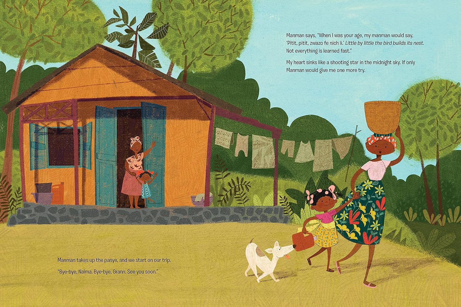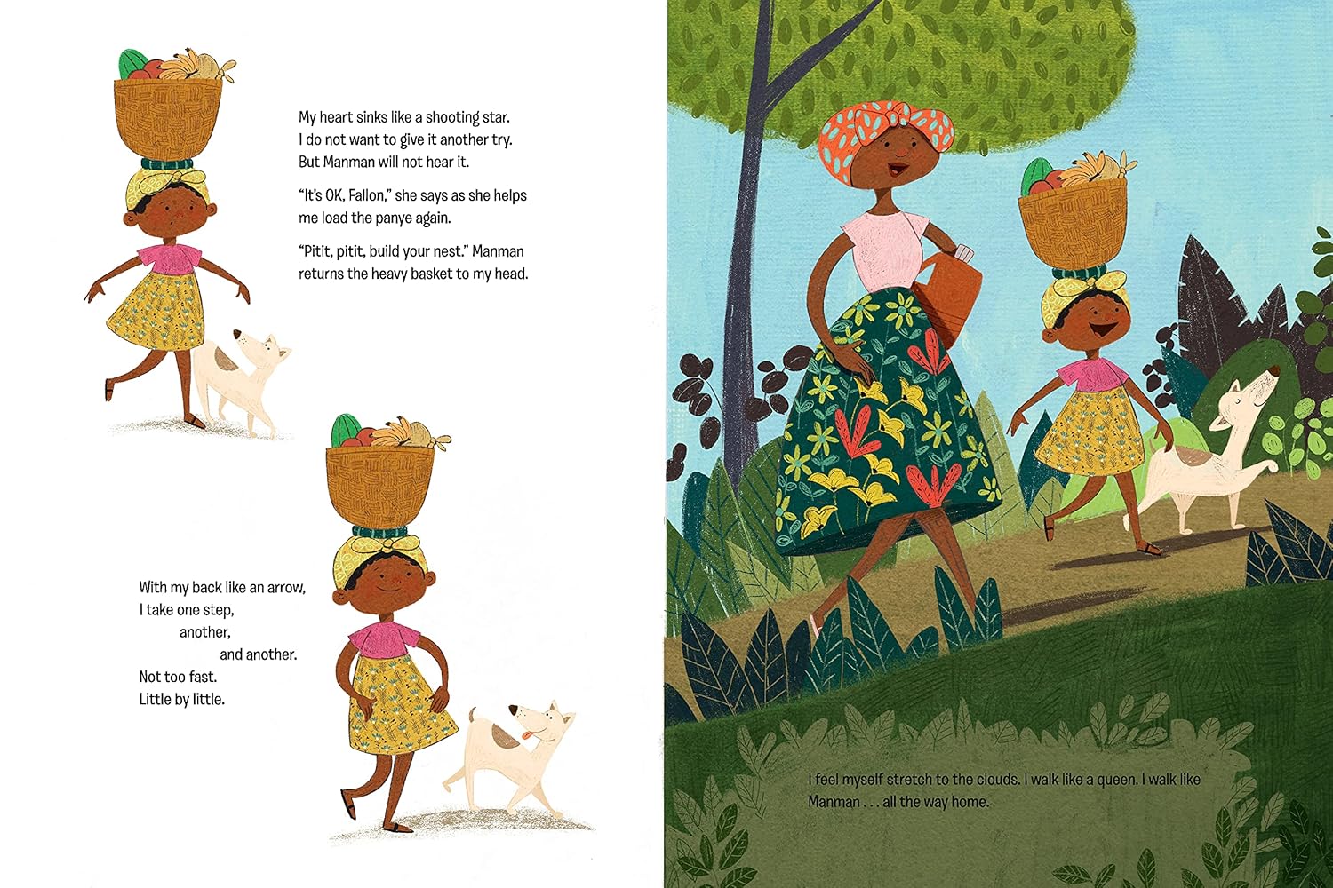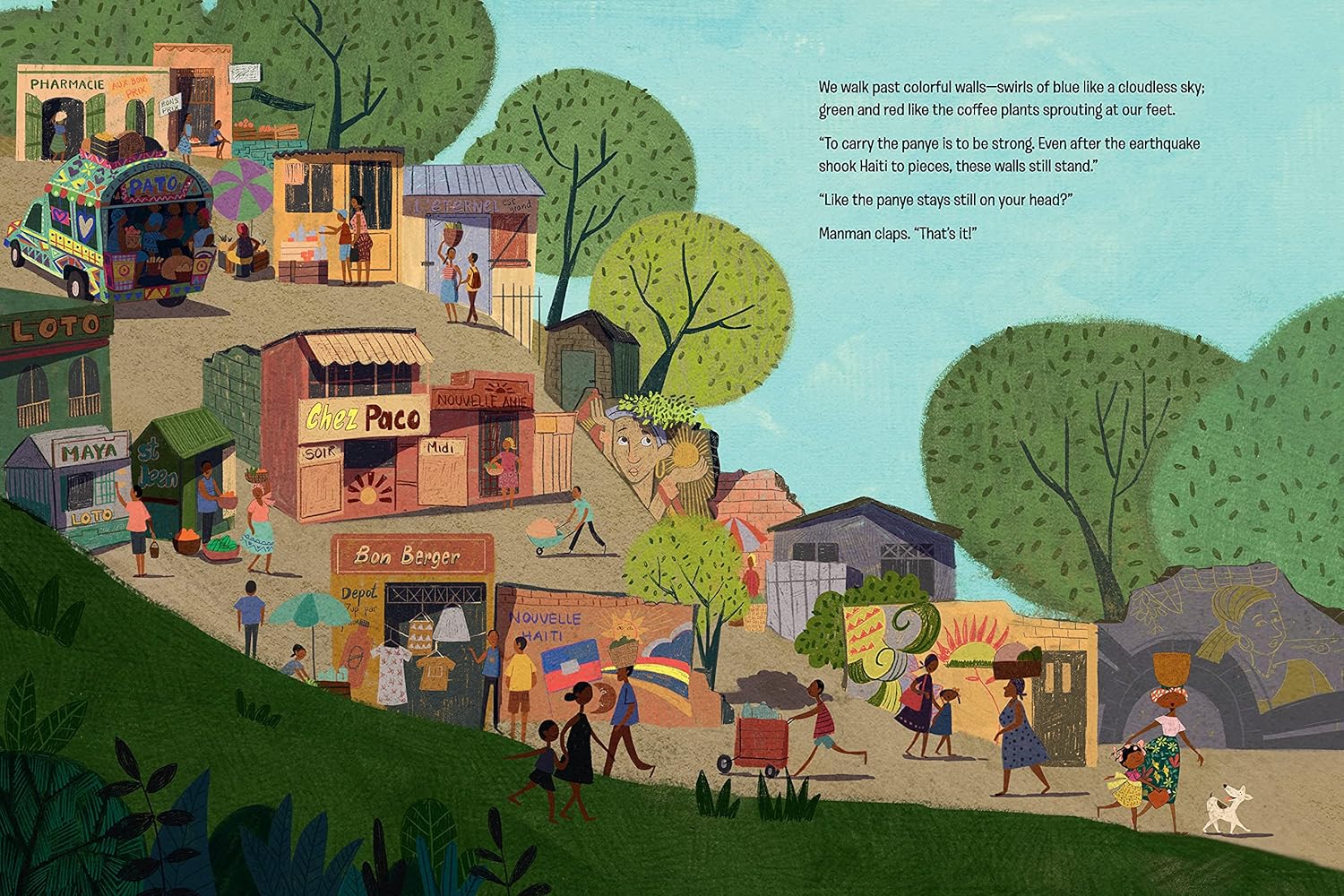 The panye means we are graceful when the load is heavy. We are strong, even when the earth is not. We are family, fed from love. Fallon is going to the market with Maman. She ties her hair in a sun-yellow mouchwa, and places the panye carefully on her head. Fallon's toes tingle, she takes few few steps towards the door, and, BOOM!, the panye falls on the floor. "Little by little the bird builds its nest," Maman says, "not everything is learned fast.” As they walk past colourful walls under swirls of blue, cloudless sky, Maman carries the panye still on her head, graceful and strong. At the market, they buy their dinner, filling the panye with all kinds of fruits and vegetables. Then, as the sun dances across the sky, it's time to go home, and time for Fallon to try once again to carry the panye. Will she be able to hold her head, graceful and strong, like Maman?