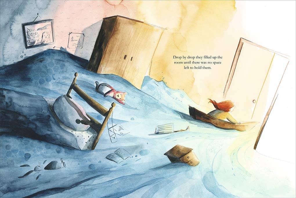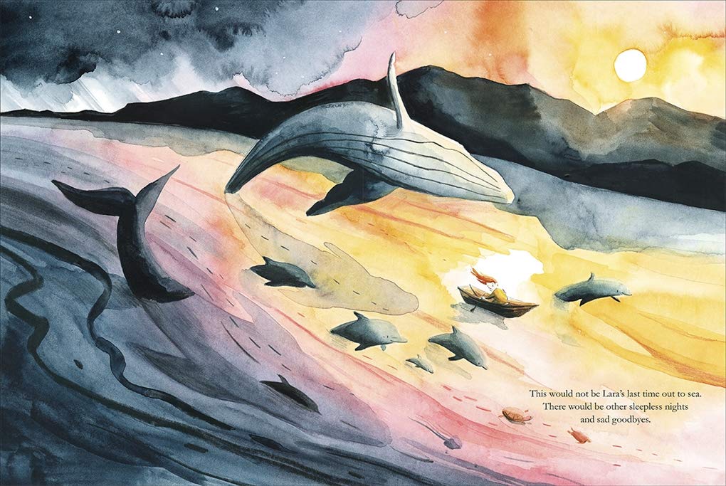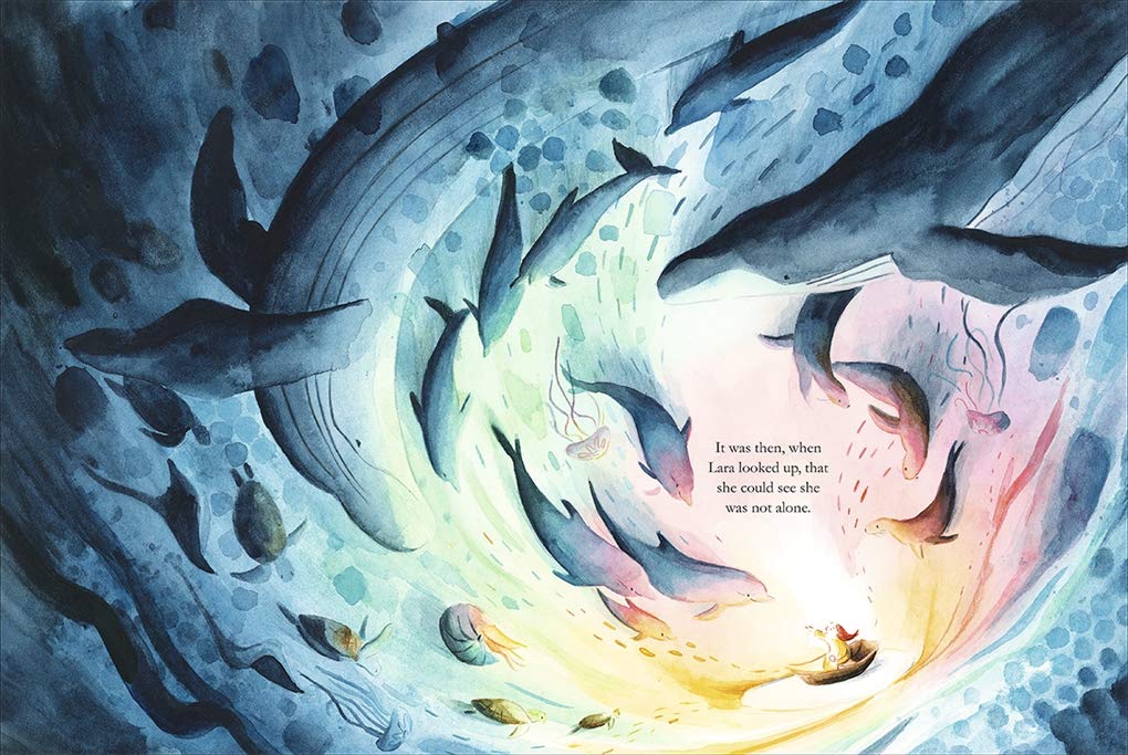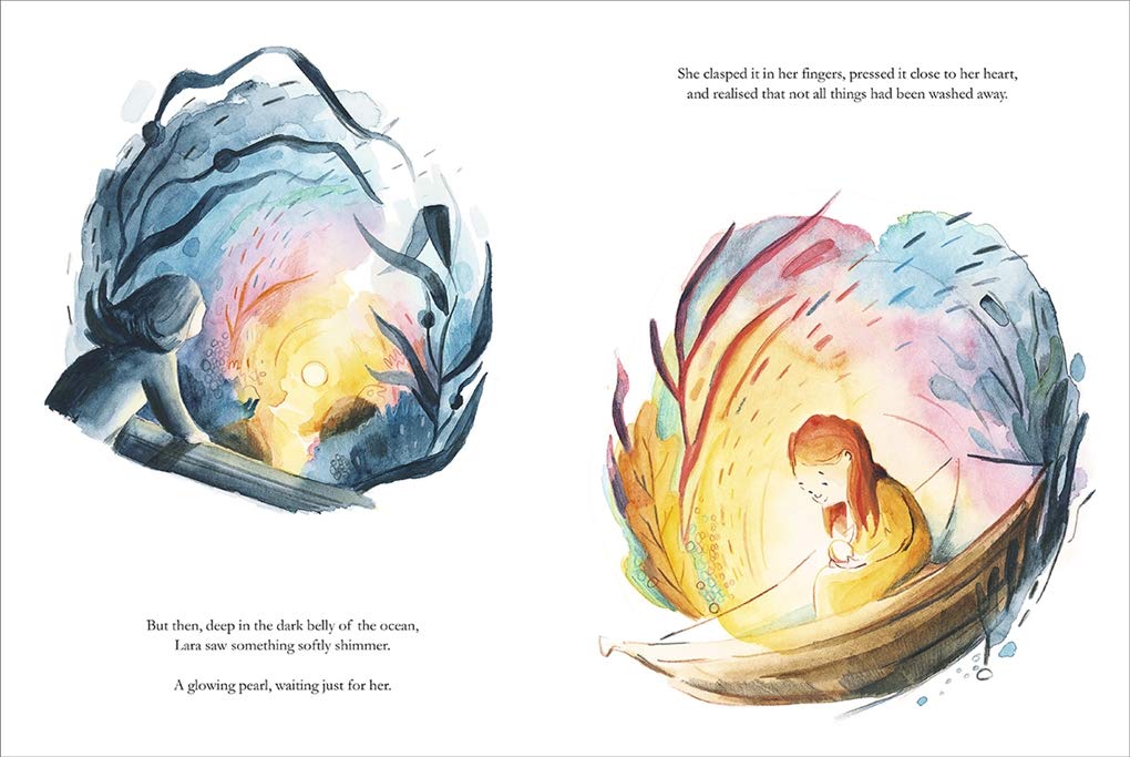 Out to Sea follows the journey of a young girl named Lara who is so sad after the death of her grandmother that she is carried out to sea on a flood of her own tears. When it seems like sadness has overwhelmed her entirely, she discovers a pearl at the bottom of the ocean that triggers memories of the many happy times Lara shared with her grandmother. With the pearl safely at her side, Lara realises that she is not alone and finds the strength to pick up her oars and row herself back home.
