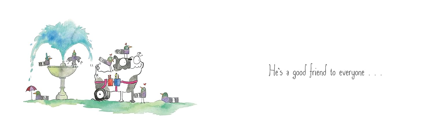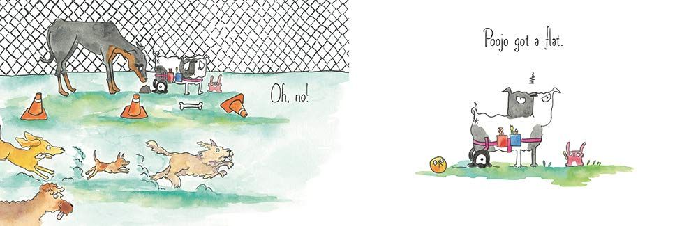 What a good dog Poojo is! He's a great friend to everyone and everything (pigeons and scooters included). He's creative and clever (how many other dogs can pop a wheelie?). And he definitely is fast--look at him chasing that squirrel, or leading his doggie pals in a race through the park! There's no stopping this joyful pup, even when he's briefly faced with a flat tire. Poojo can do anything! Inspired by a dog in their neighborhood, debut author-illustrator Charrow spins a sweet and empowering story of a lovable, determined pup who entered the world with two legs--but with the help of some wheels accomplishes whatever he sets his mind to.
