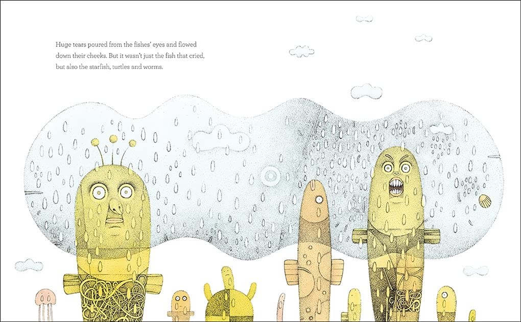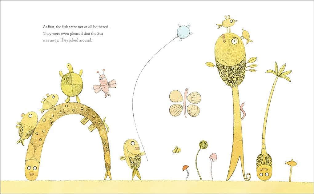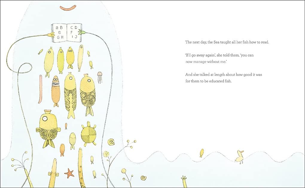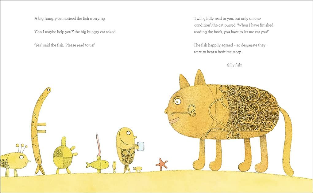 The Sea loves her fish children very much and reads to them every day. One day, when the fish are being especially loud, the Sea disappears in hope of some peace and quiet. At first the fish children enjoy the chance to misbehave, but become distraught when they realise they have no one to read them a bedtime story. An opportunistic cat promises to read them a story on the condition that they let it eat the fish afterwards. The fish are so desperate, they agree. It is only after their story has finished that the implications of their decision sinks in. They cry so profusely that their salty tears bring the Sea back, much to the disappointment of the cat. The Sea promises to teach her fish how to read so that if she ever needs a break again, the fish will be safe from harm.