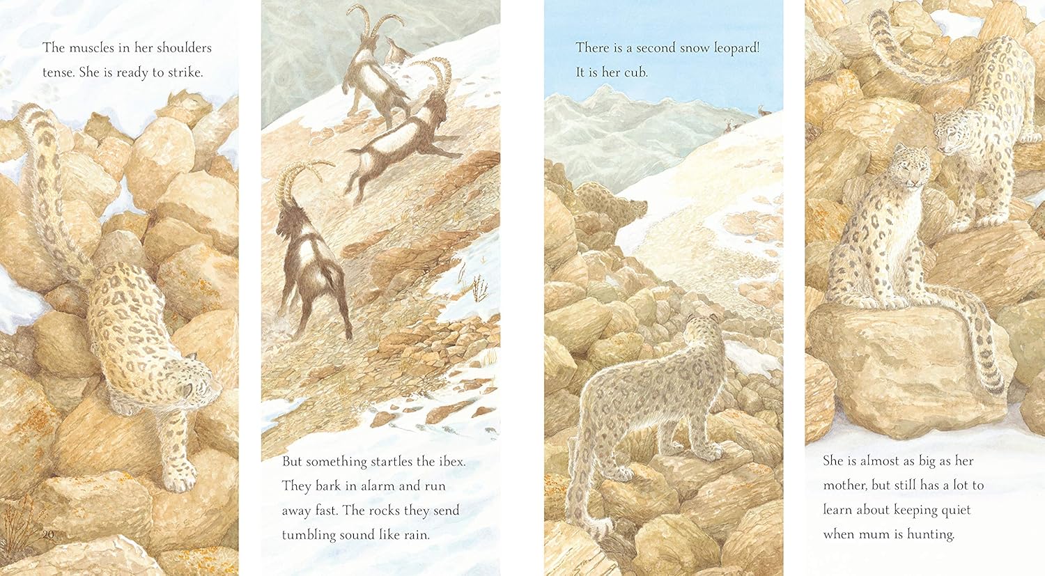 "Something moves in the rocks ahead. My hands start to tremble. My heart is beating fast. There, just a few footsteps away, is a snow leopard.