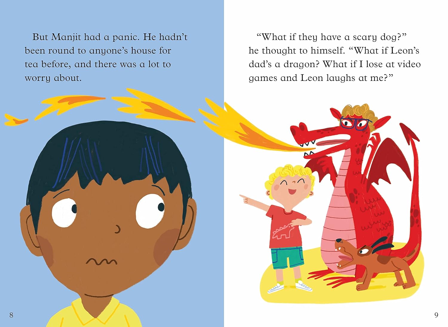 Manjit is going to his new friend Leon's house for tea. There's lots to be worried about… What if they have a scary dog? What if Leon's dad is a dragon? But worst of all, what if they're having pancakes for tea! This relatable comedy about new friendships from prolific children's writer Joanna Nadin is perfect for Key Stage 1 (KS1) children who are learning to read by themselves. It features lively colour illustrations by Ana Gómez, and a storyline that encourages picky eaters to try new foods.