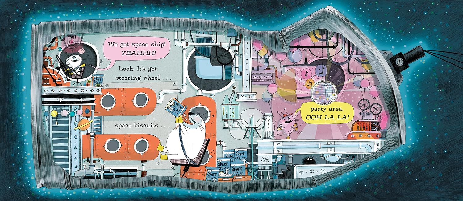 We are friends on epic adventure to Planet Earth! We got space ship! YEAHHH! Look it's got steering wheel, space biscuits and party area. OOH LA LA!