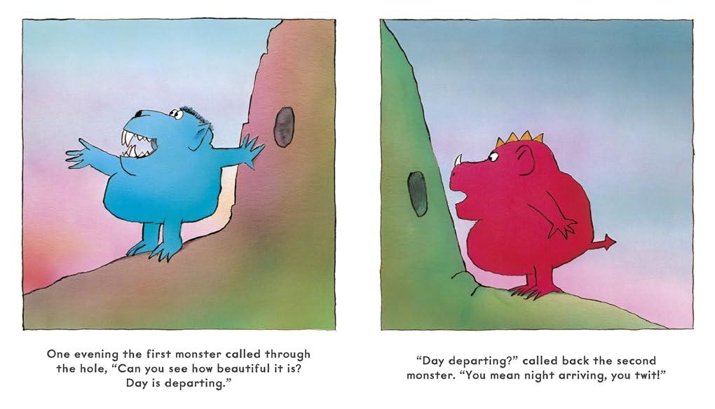 Two monsters live on either side of a mountain. Sometimes they talk through the hole in the mountain, but they never see each other. One evening, they get into a silly argument about whether day is departing or night is arriving, which escalates into a rock throwing fight, which eventually destroys the mountain, and enables the monsters to see each other's point of view and live together as friends.