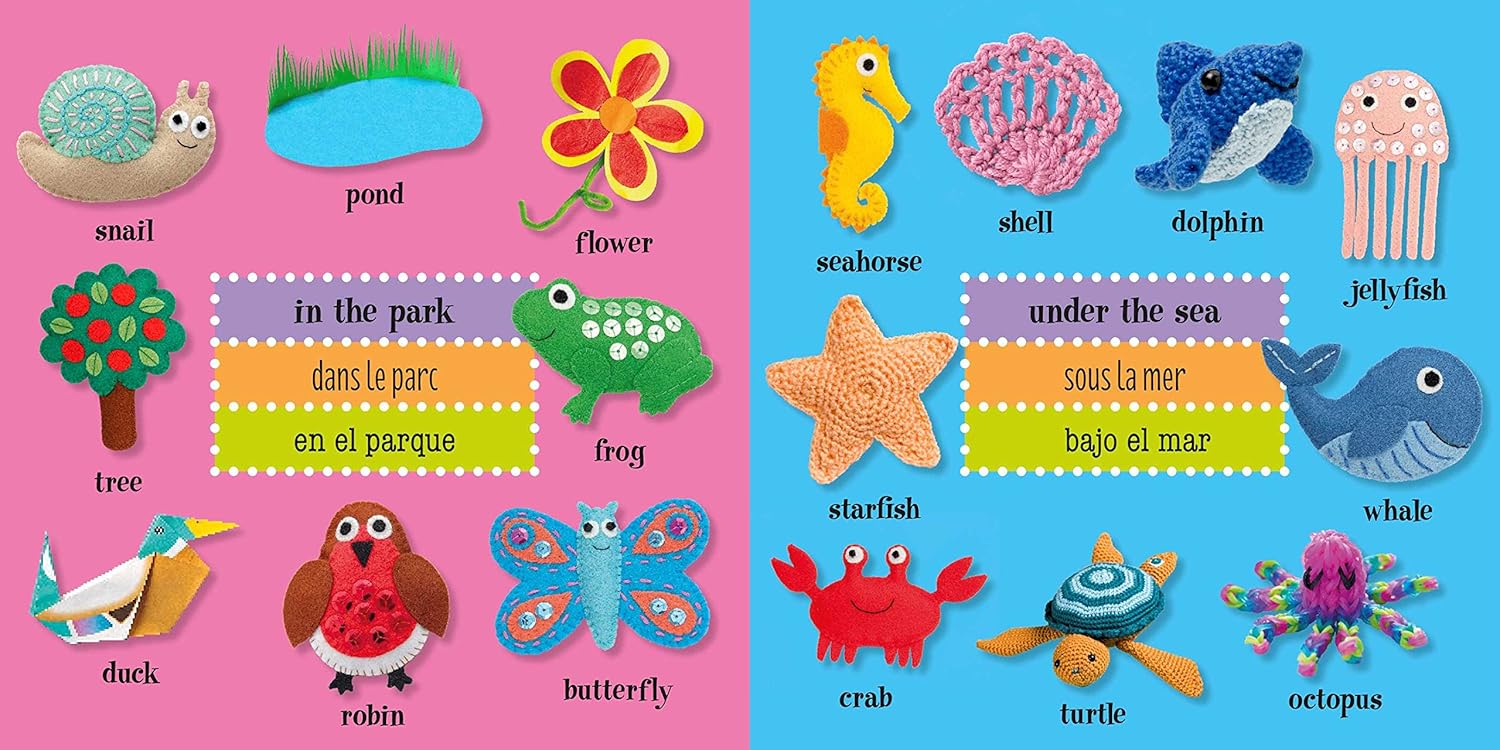 An illustrated book of 100 first words in English, French and Spanish, including 100 double-sided flash cards.