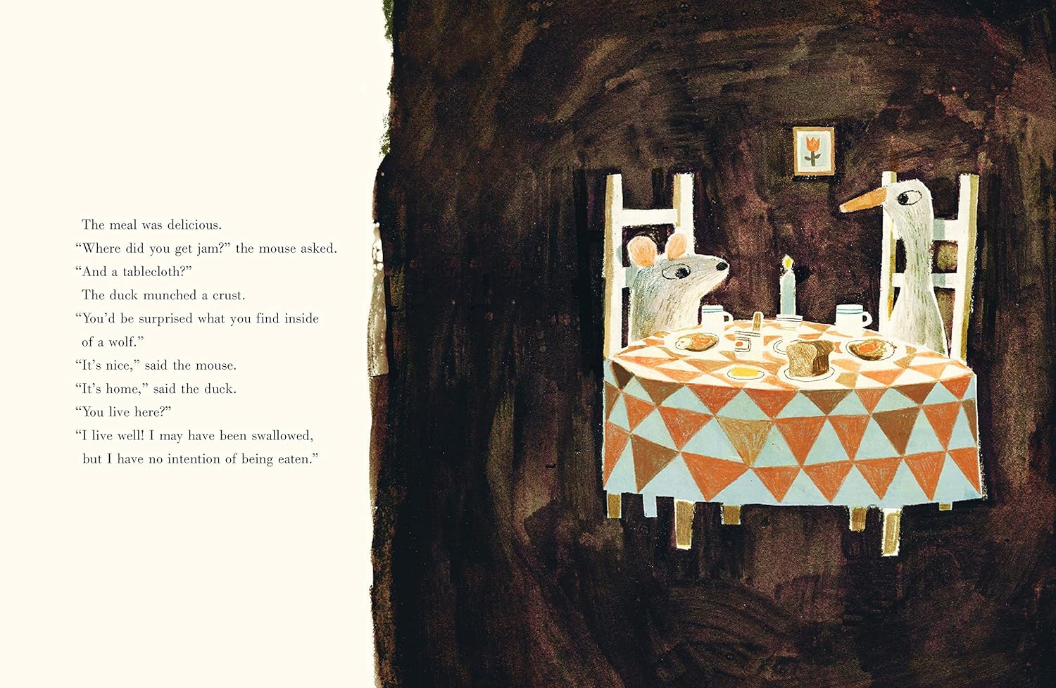 When a woeful mouse is swallowed up by a wolf, he quickly learns he is not alone: a duck has already set up digs and, boy, has that duck got it figured out! Turns out it's pretty nice inside the belly of the beast there's delicious food, elegant table settings and, best of all, dancing. And there's something more: no more fear of being eaten by a wolf! Life's not so bad, considering the alternatives. That is, until a hunter shows up... With a nod to traditional fables and a wink to the reader, the award-winning Mac Barnett and Jon Klassen of Sam and Dave Dig a Hole, Extra Yarn and Triangle offer a tale of cooperation and creative cuisine that is sure to go down easy.